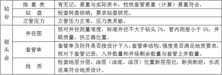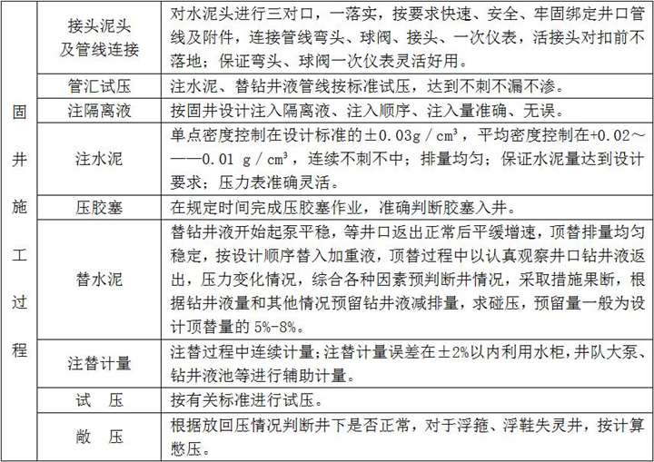 2、固井施工:按設計注入隔離液,水泥漿壓膠塞,頂替鉆井液、碰壓、試壓完成、固井施工過程檢查點項及要求如下: